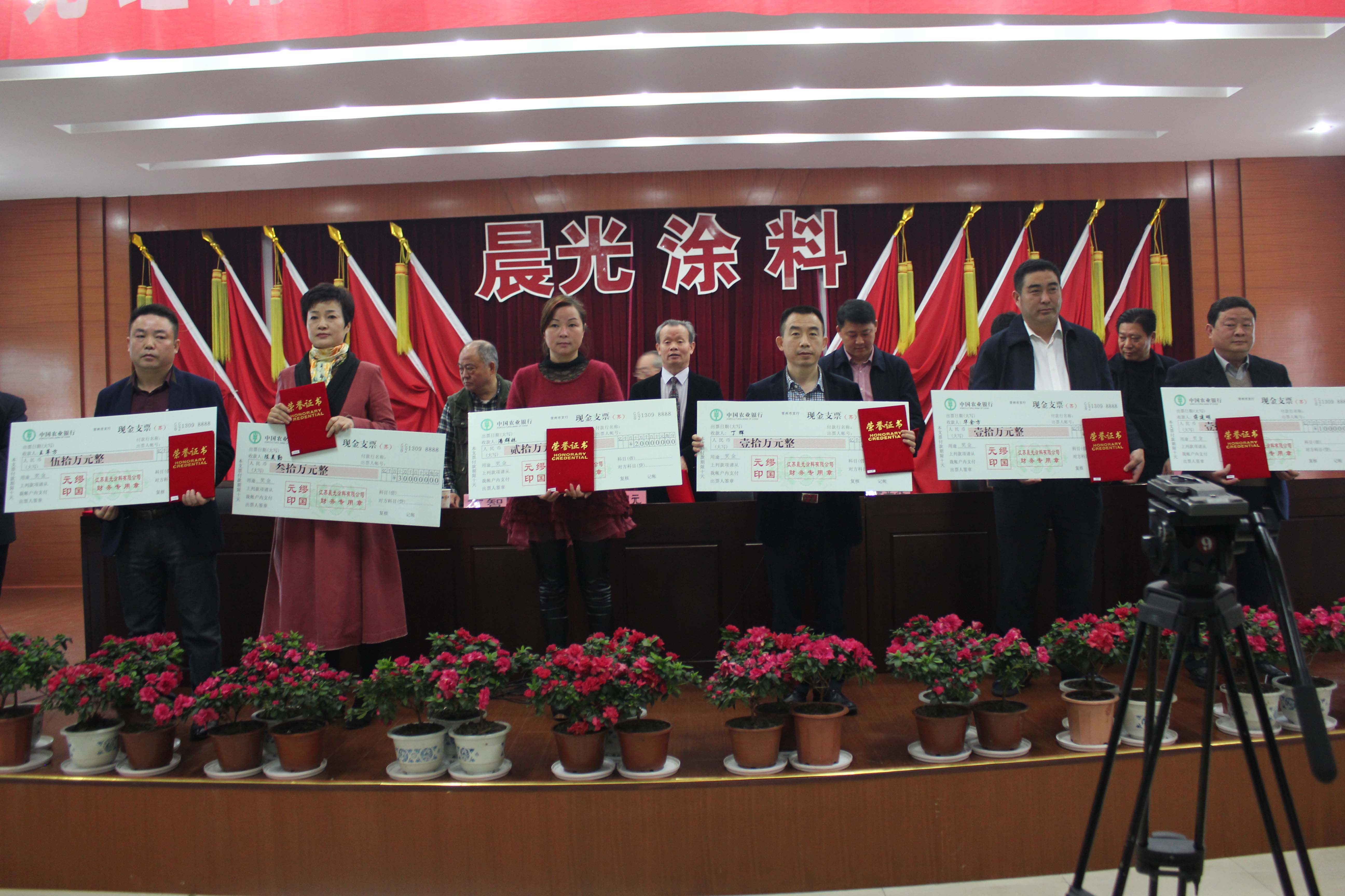 大会还为2014年度涂料销量名列前茅的经销商代表颁发了奖品,其中前三名依次是王革方50万元、陈美琴30万元、潘群美20万元。