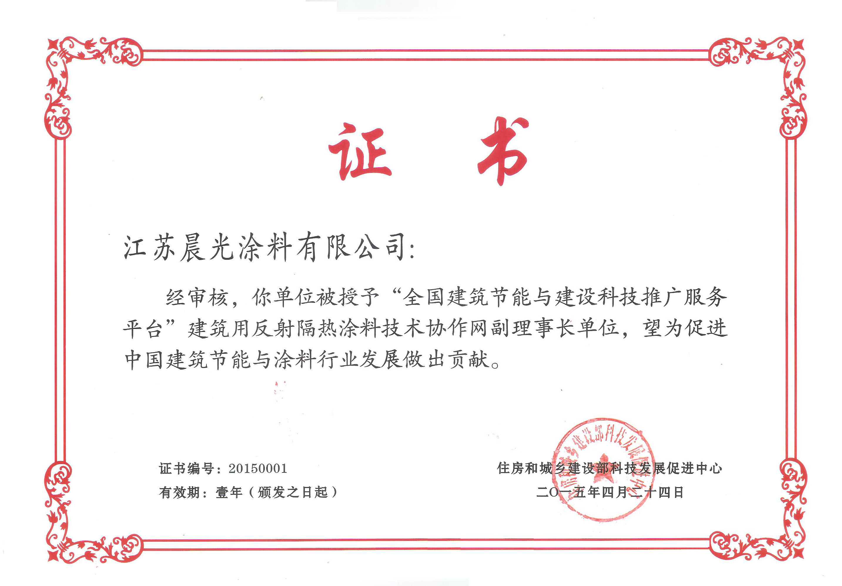江苏beats365(中国区)-唯一官方网站涂料有限公司被授予“全国建筑节能与建设科技推广服务平台”建筑用反射隔热涂料技术协作网副理事长单位。